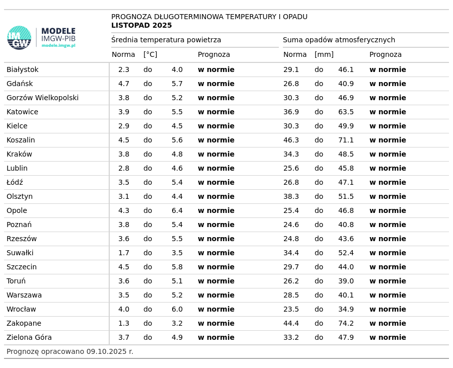 Rys. 1. Prognoza średniej miesięcznej temperatury powietrza i miesięcznej sumy opadów atmosferycznych na listopad 2025 r. dla wybranych miast w Polsce.