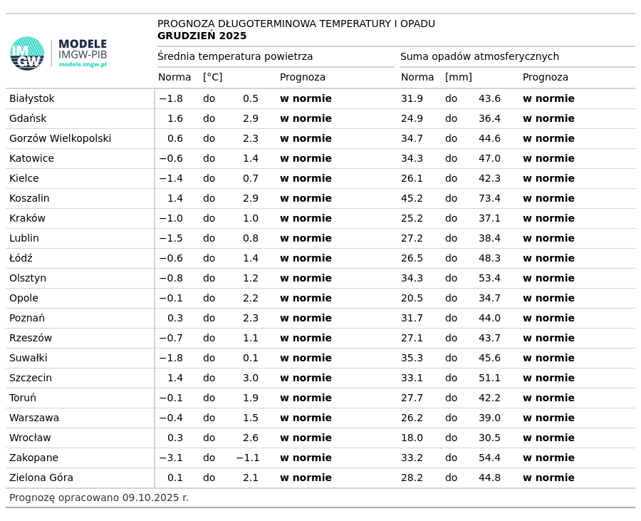 Rys.2. Prognoza średniej miesięcznej temperatury powietrza i miesięcznej sumy opadów atmosferycznych na grudzień 2025 r. dla wybranych miast w Polsce.