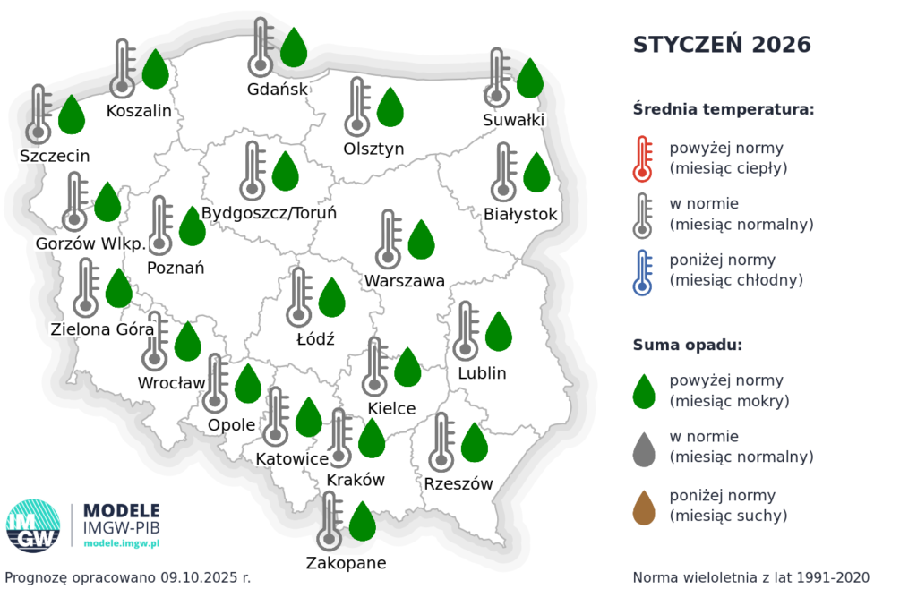 Rys. 3. Prognoza średniej miesięcznej temperatury powietrza i miesięcznej sumy opadów atmosferycznych na styczeń 2026 r. dla wybranych miast w Polsce.