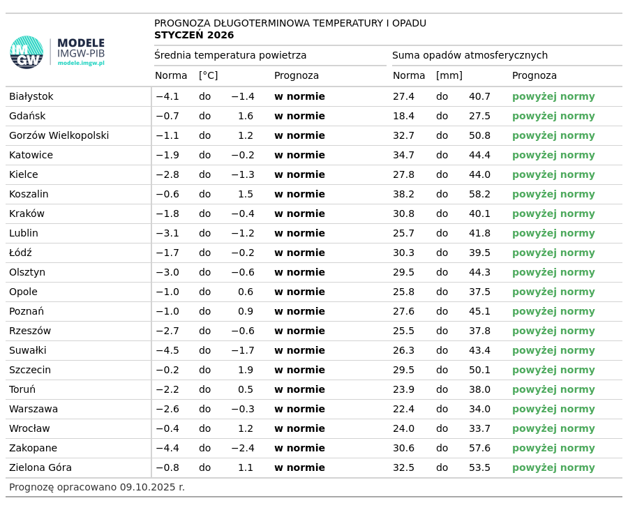 Tab. 3. Norma średniej temperatury powietrza i sumy opadów atmosferycznych dla stycznia z lat 1991-2020 dla wybranych miast w Polsce wraz z prognozą na styczeń 2026 r.