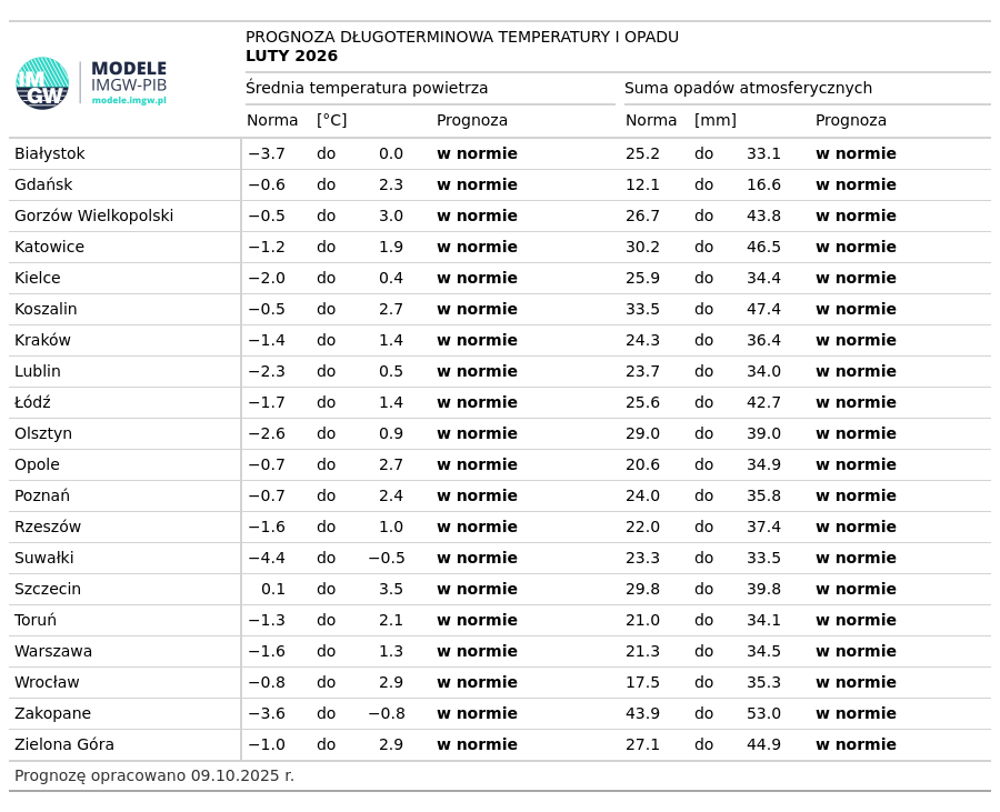 Tab. 4. Norma średniej temperatury powietrza i sumy opadów atmosferycznych dla lutego z lat 1991-2020 dla wybranych miast w Polsce wraz z prognozą na luty 2026 r.