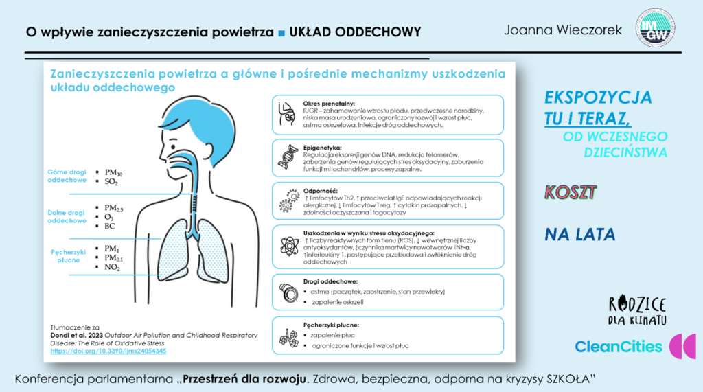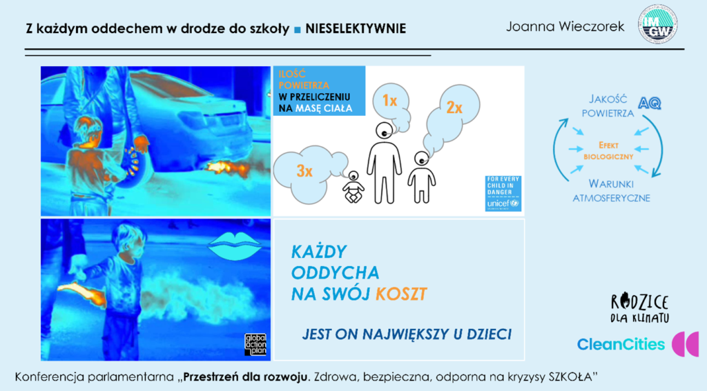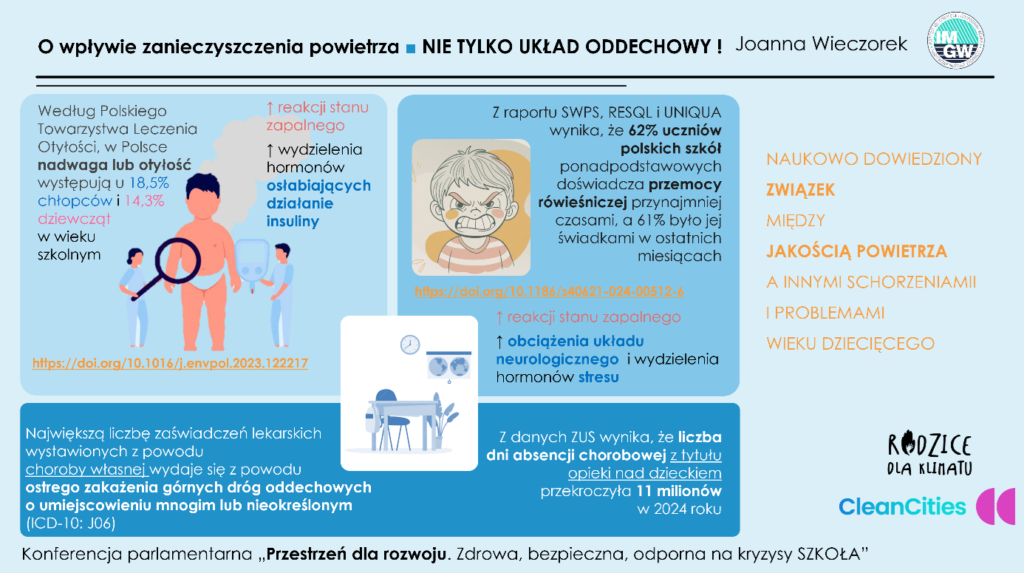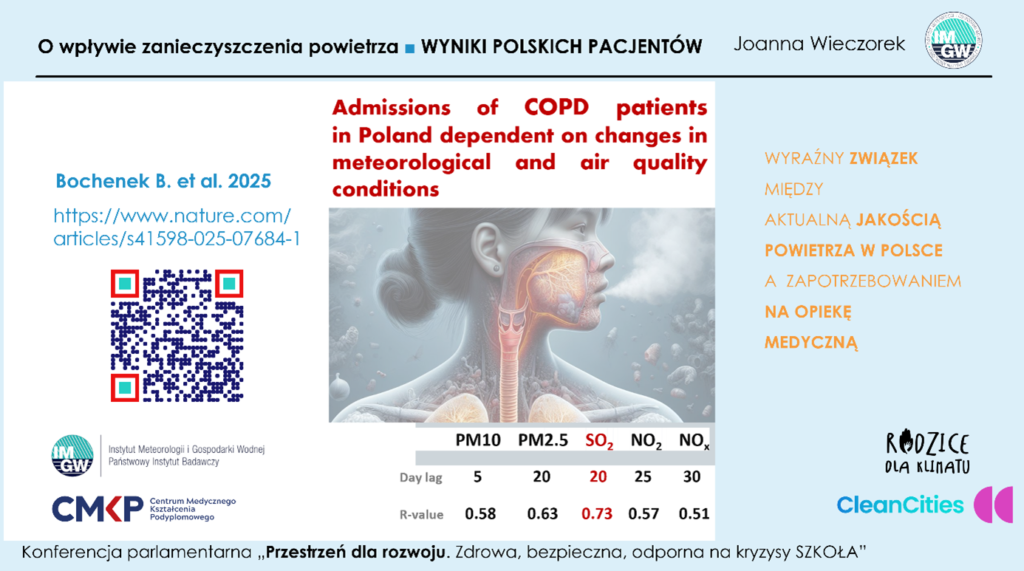 W miniony piątek, 10 października 2025 r w siedzibie Komisji Sejmowych odbyła się konferencja pt: „Przestrzeń dla rozwoju. Zdrowa, bezpieczna i odporna na kryzysy szkoła”. Na zaproszenie przewodniczącej Zespołu Parlamentarnego „Rodzice dla Klimatu” ds. edukacji klimatycznej pani prof. dr hab. Alicji Chybickiej prezentację pt: „Z każdym oddechem w drodze do szkoły. O wpływie zanieczyszczenia powietrza” wygłosiła dr Joanna Wieczorek z CMOK LMM IMGW-PIB.