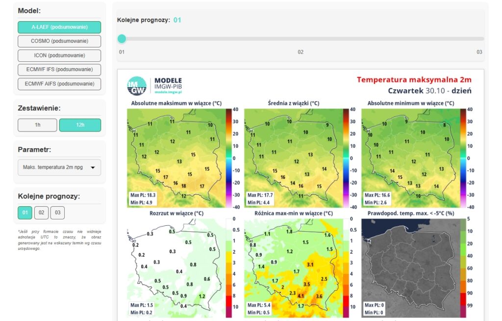 Zależnie od modelu generowane są zestawienia dla wybranych parametrów meteorologicznych w kolejnych krokach prognozy. W każdym zestawieniu uwzględniono graficzną prezentację rozkładu wartości średniej, absolutnego minimum i maksimum, amplitudy min-max, rozrzutu w wiązce oraz prawdopodobieństwa wystąpienia wartości charakterystycznych danego elementu meteorologicznego. Wybór modelu, zestawienia czasowego lub terminu startu prognozy, parametru oraz kolejnych terminów realizacji możliwy jest w menu po lewej stronie. Kolejne terminy można również przeglądać posługując się suwakiem nad polem z mapami. Jeśli przy formacie czasu nie widnieje adnotacja UTC to znaczy, że obraz generowany jest na wskazany termin wg czasu urzędowego.