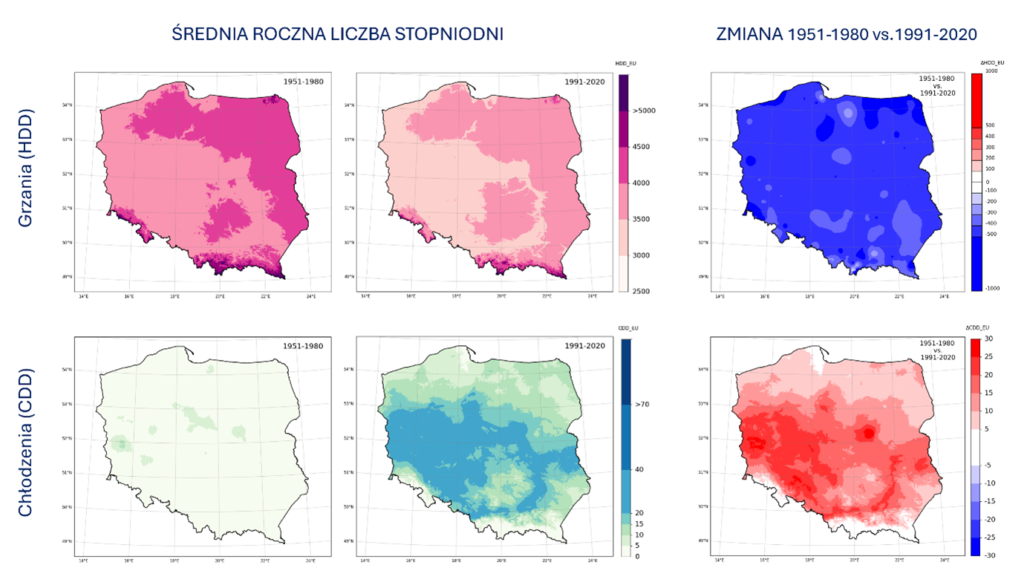 Warunki termiczne w Polsce obserwowane w okresie ostatnich siedmiu dekad uległy zmianie, co ma realny wpływ na procesy utrzymania i korzystania z obiektów, a zwłaszcza na nakłady energetyczne w celu zapewnienie komfortu ich użytkowania. W opracowaniu dostępnym na stronie Pracowni wykorzystano wskaźniki stopniodni grzania (HDD) i chłodzenia (CDD). Poza wartością wskaźników i średniego rozkładu przestrzennego na obszarze Polski oraz ich zmienności w okresach referencyjnych dokonano również porównania metodyki opracowania HDD i CDD, a także porównania serii historycznych danych obserwacyjnych i pochodzących z wyników symulacji opracowanych w ramach inicjatywy EURO-CORDEX. Publikacja dostępna jest pod adresem https://modele.imgw.pl/?page_id=45610, również w formacie PDF do pobrania.