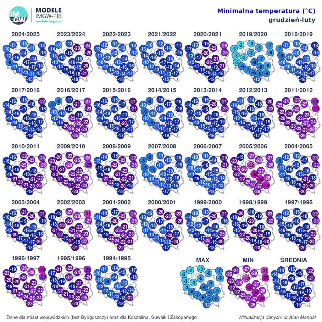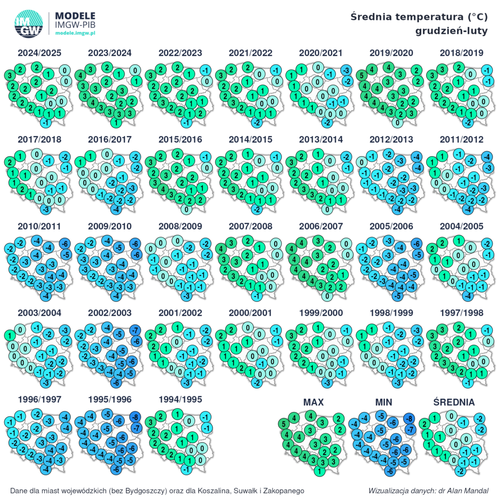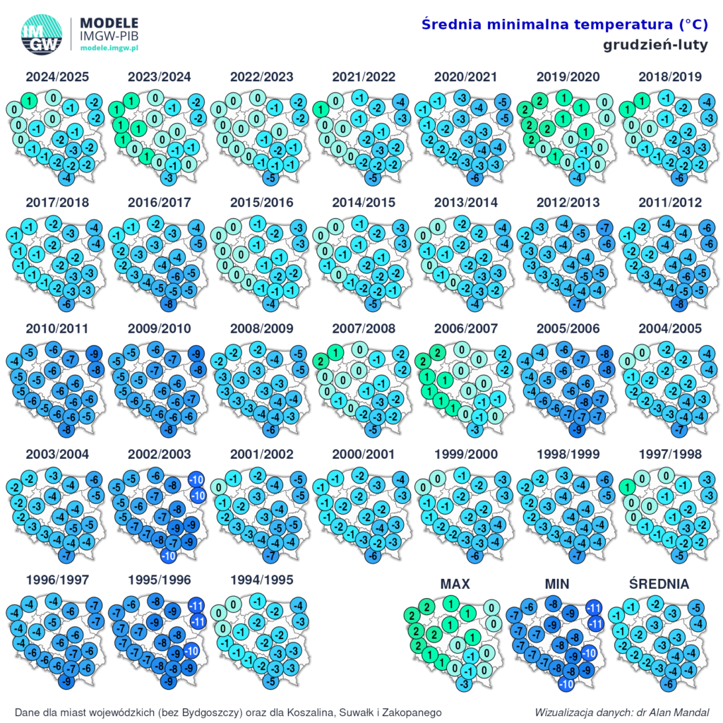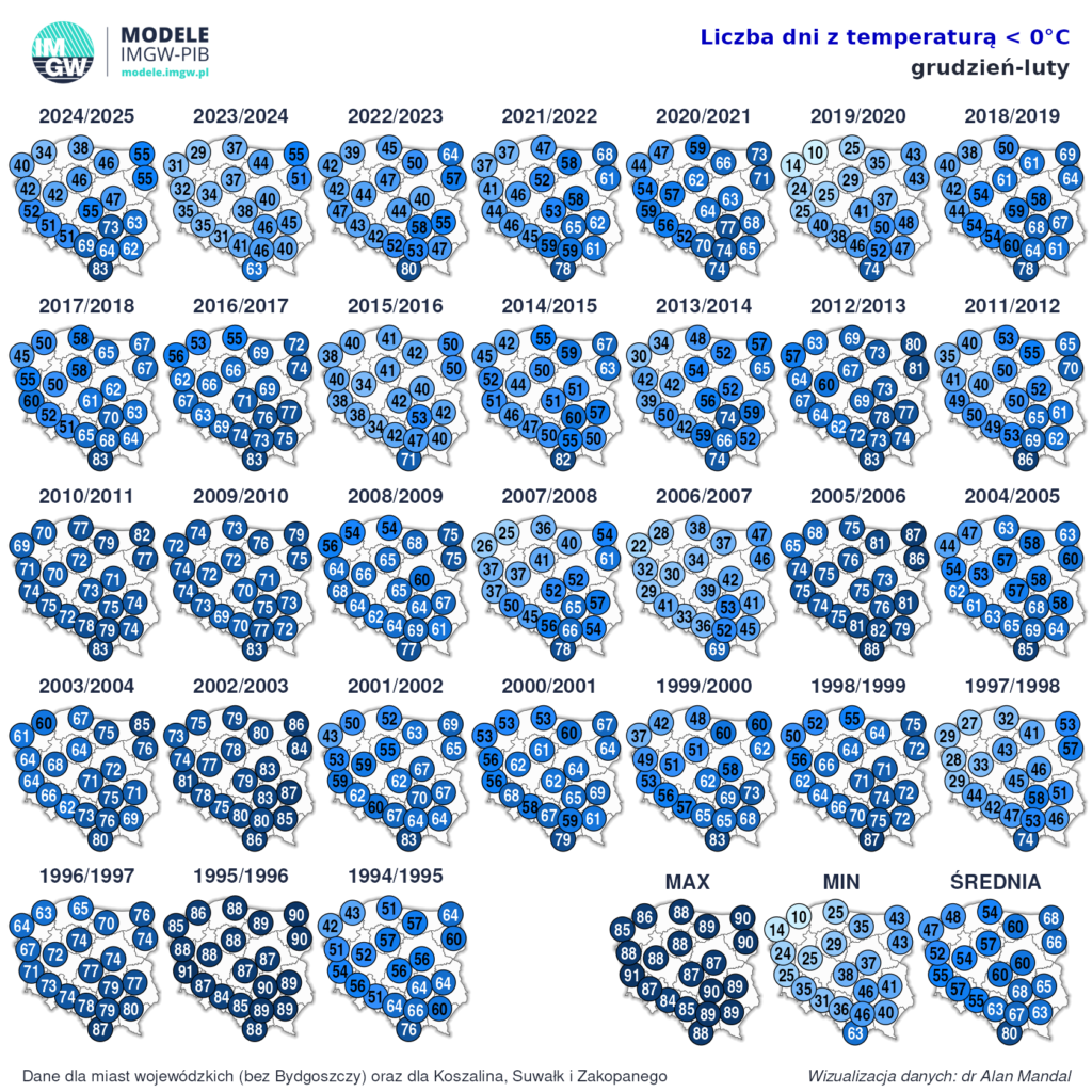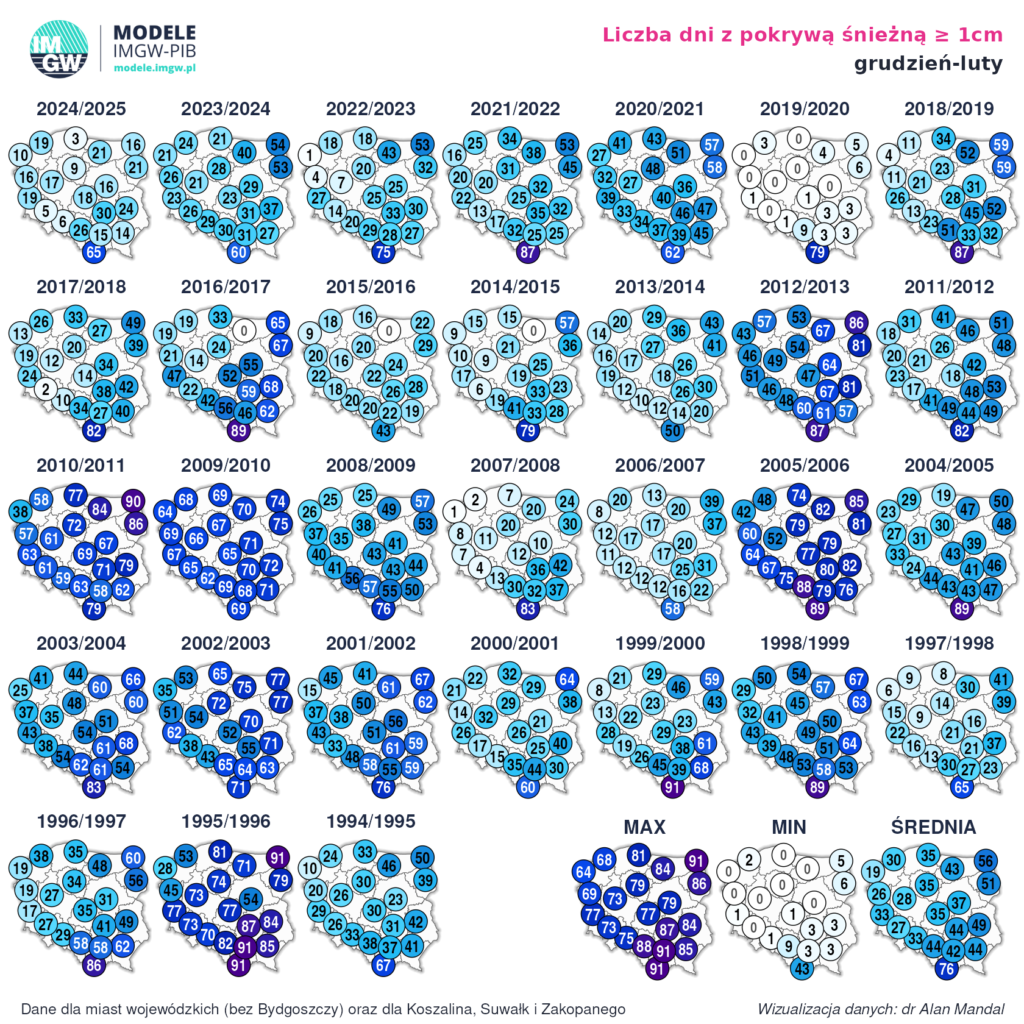 Laboratorium Modelowania Meteorologicznego przygotowało zestawienia charakterystyk elementów meteorologicznych w okresie kolejnych zim meteorologicznych w ostatnim 30-leciu . Zima meteorologiczna to okres począwszy od 1 grudnia do końca lutego, a zatem obejmuje okres kolejnych 90 dni (91 w roku przestępnym). Dane wykorzystane w opracowaniu pochodzą z bazy pomiarów sieci IMGW-PIB realizowanych na stacjach synoptycznych zlokalizowanych w miastach wojewódzkich oraz w Suwałkach, Koszalinie i Zakopanem. Zestawienia nie uwzględniają danych z obserwatoriów wysokogórskich na Kasprowym Wierchu i Śnieżce. Na mapach zaprezentowano wartości w zaokrągleniu do całkowitych.