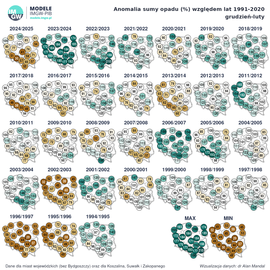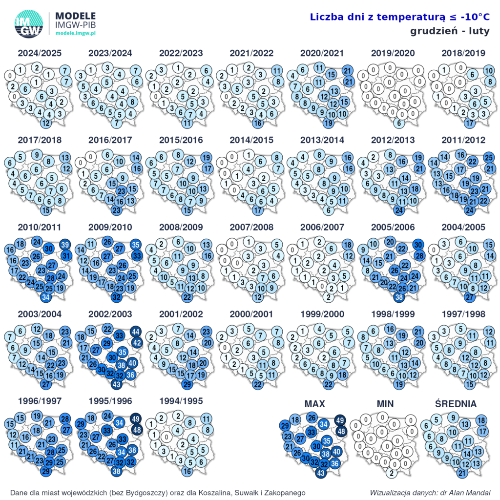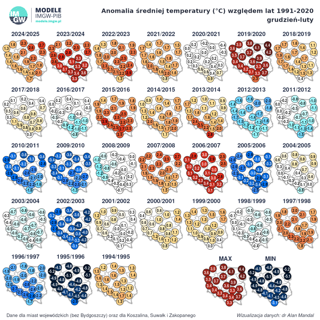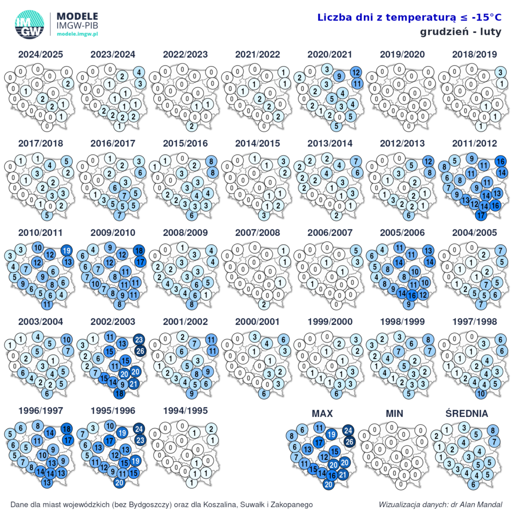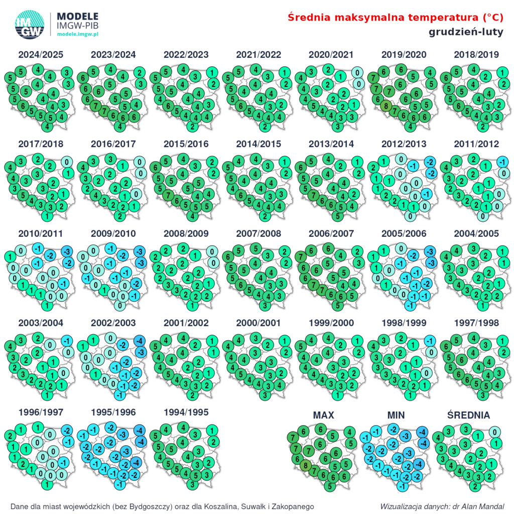 Laboratorium Modelowania Meteorologicznego przygotowało zestawienia charakterystyk elementów meteorologicznych w okresie kolejnych zim meteorologicznych w ostatnim 30-leciu . Zima meteorologiczna to okres począwszy od 1 grudnia do końca lutego, a zatem obejmuje okres kolejnych 90 dni (91 w roku przestępnym). Dane wykorzystane w opracowaniu pochodzą z bazy pomiarów sieci IMGW-PIB realizowanych na stacjach synoptycznych zlokalizowanych w miastach wojewódzkich oraz w Suwałkach, Koszalinie i Zakopanem. Zestawienia nie uwzględniają danych z obserwatoriów wysokogórskich na Kasprowym Wierchu i Śnieżce. Na mapach zaprezentowano wartości w zaokrągleniu do całkowitych.