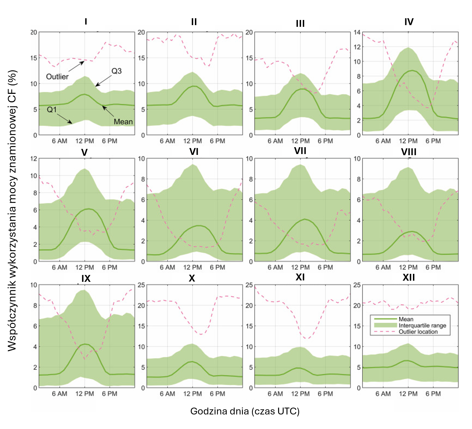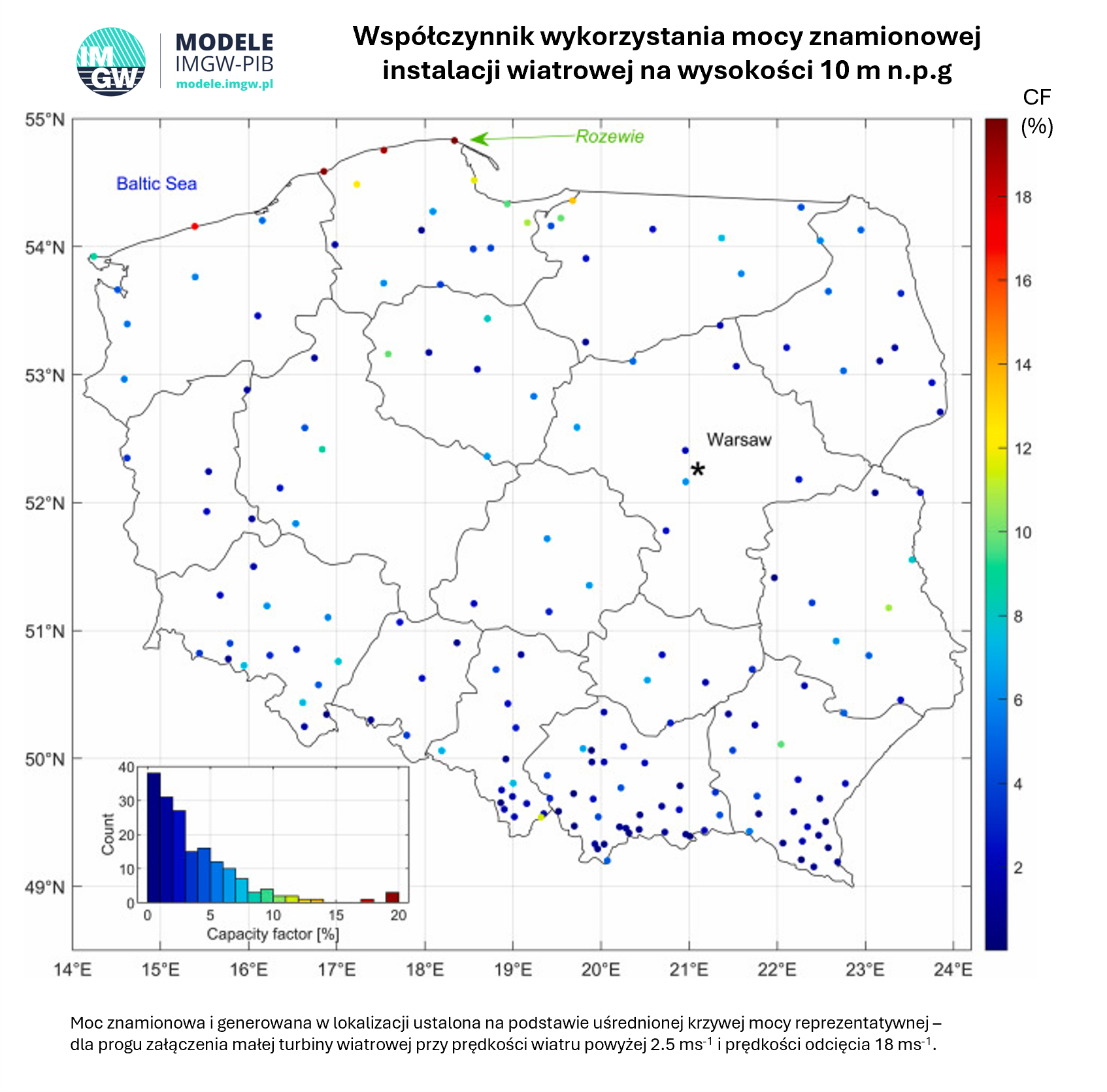 Średni 6-letni współczynnik wykorzystania mocy (Capacity factor, CF, %) dla badanych lokalizacji wyniósł zaledwie 328 kWh/kW. Tylko 13 lokalizacji (7.5%) osiągnęło CF powyżej 10%, przy czym najwyższe wartości – do 20% – odnotowano jedynie w stacjach bezpośrednio nad Bałtykiem.