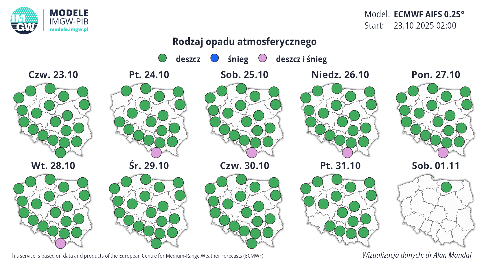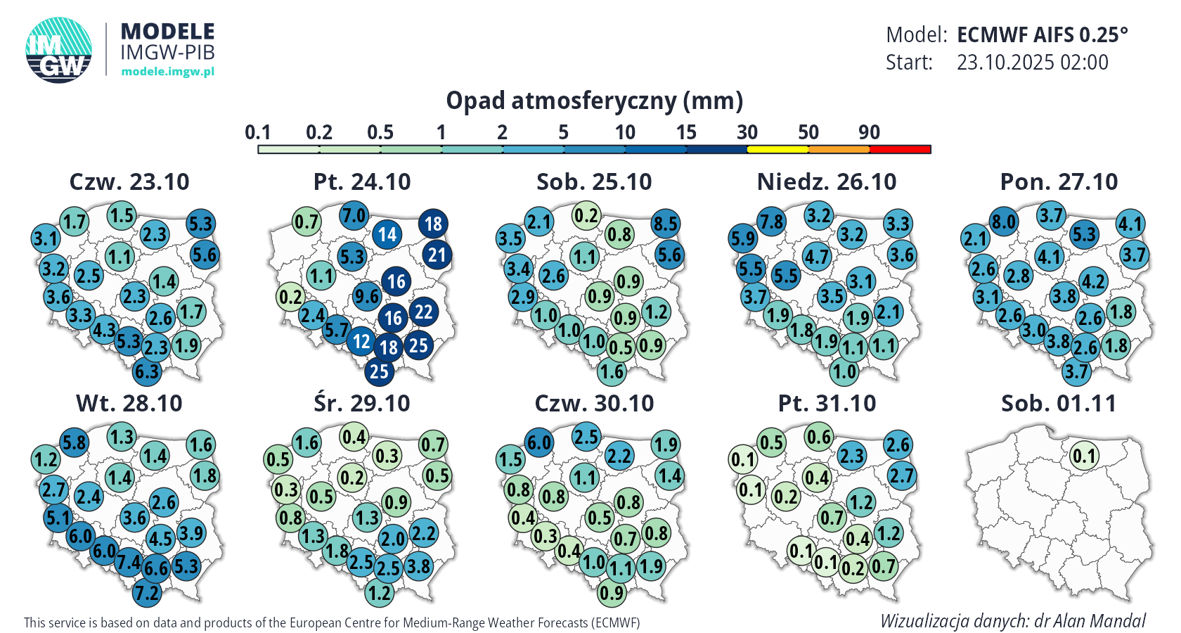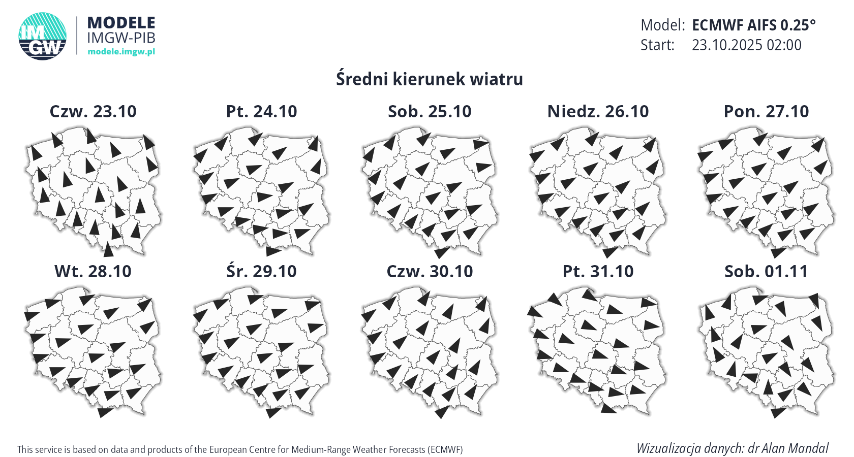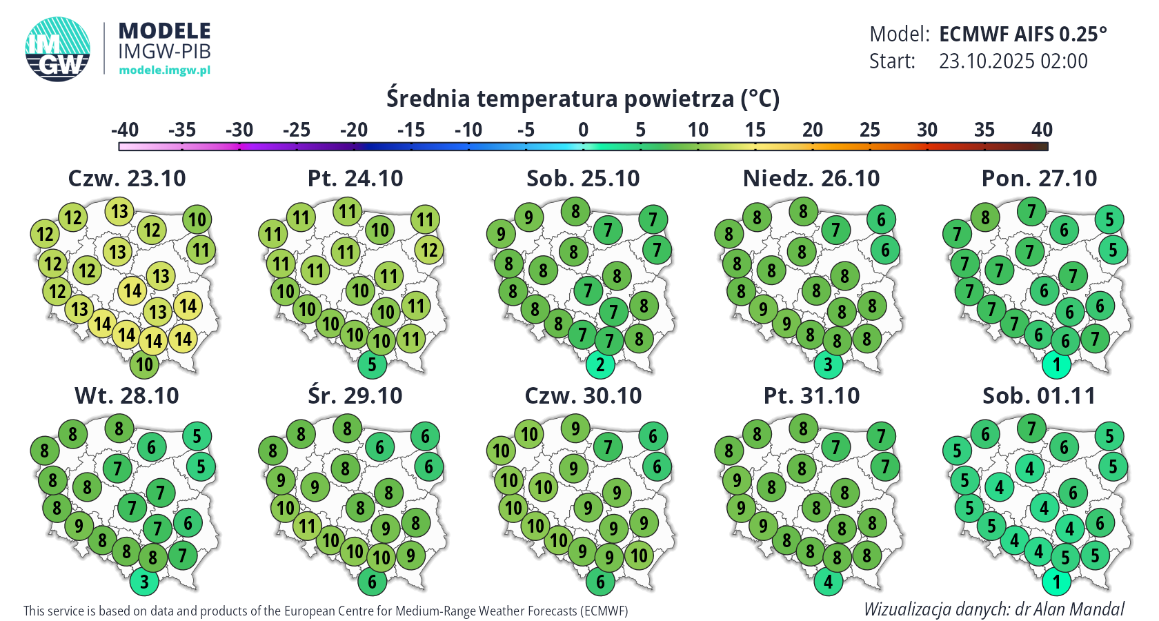 Prognoza średnioterminowa jest publikowana na podstawie wyników predykcji numerycznego modelu pogody ECMWF AIFS 0.25°. Wyniki prezentowane na mapach podlegają codziennej aktualizacji. Prawdopodobieństwo wystąpienia wskazanych wartości może ulec zmianom, zwłaszcza w przypadku terminów odległych od terminu startu modelu (> 7 dni). Więcej o modelu AIFS (czytaj dalej).