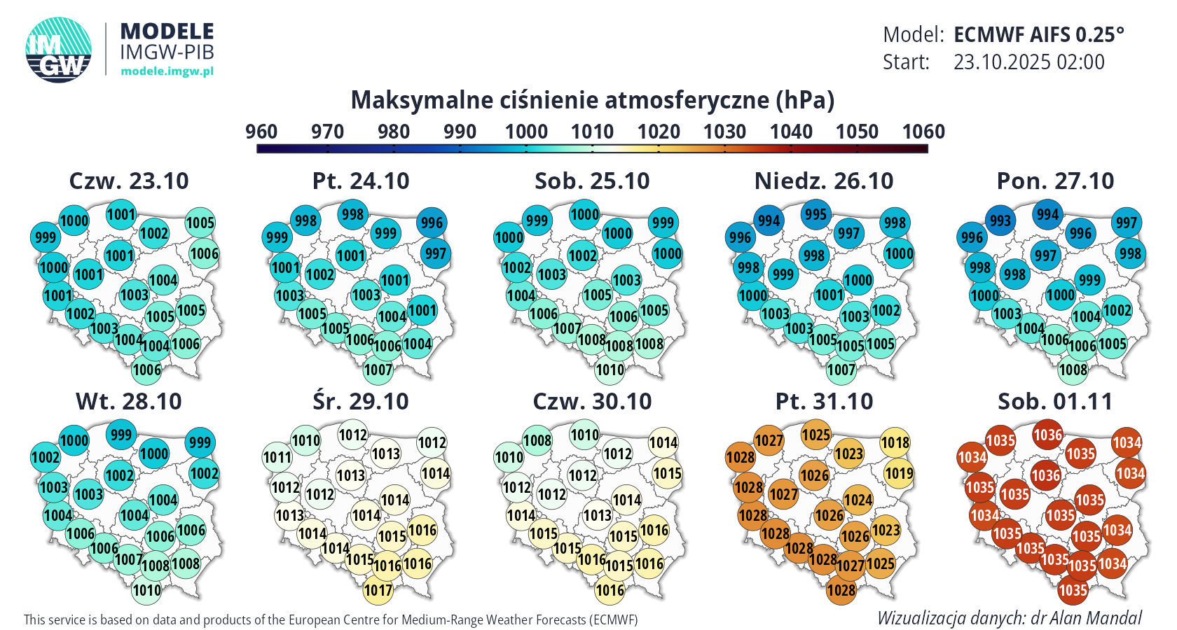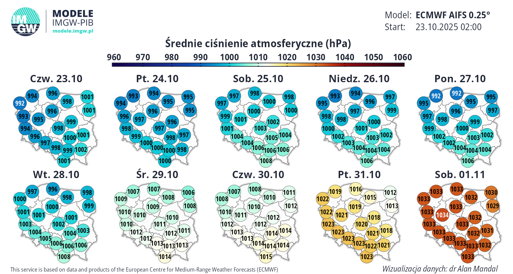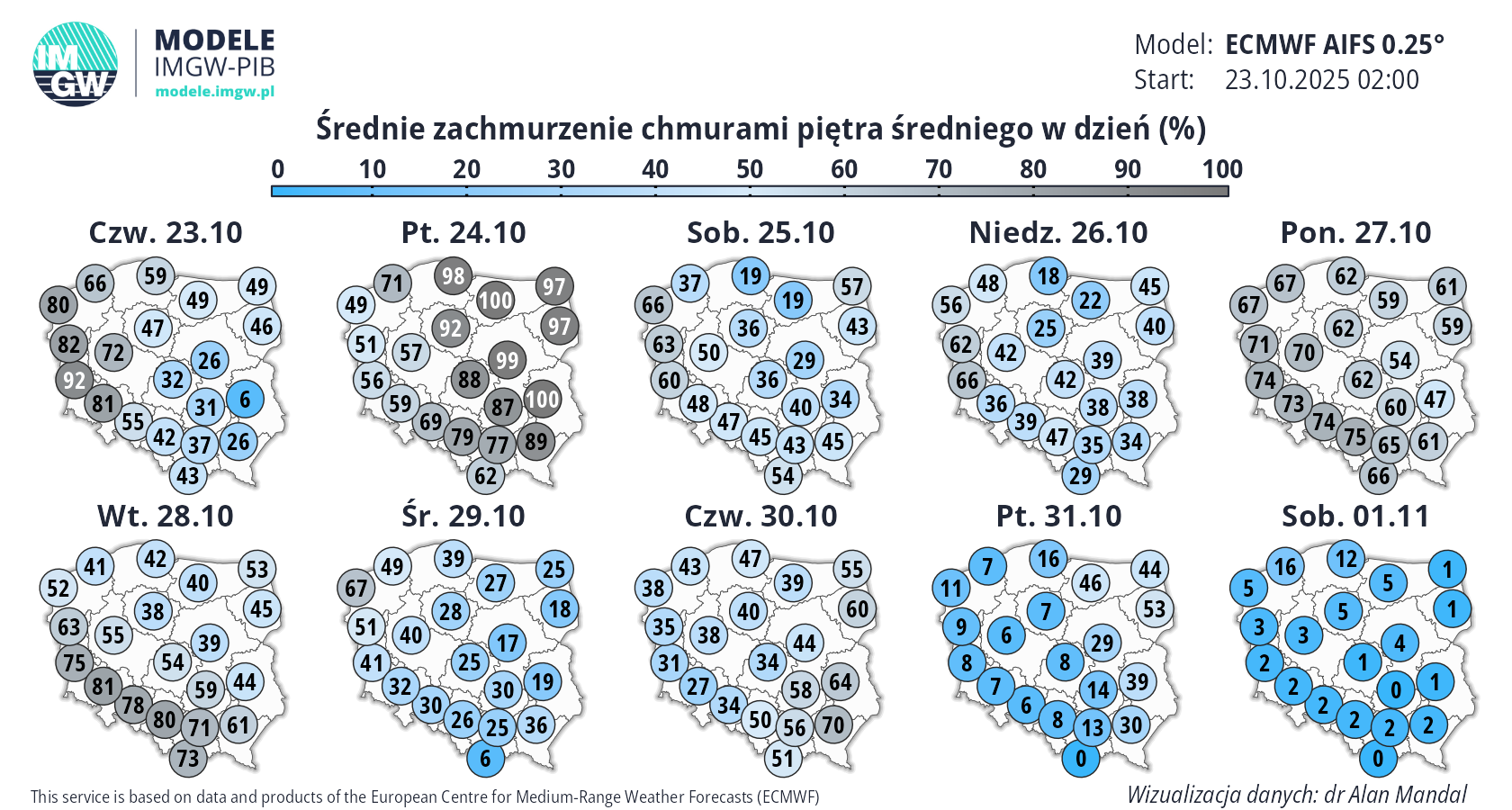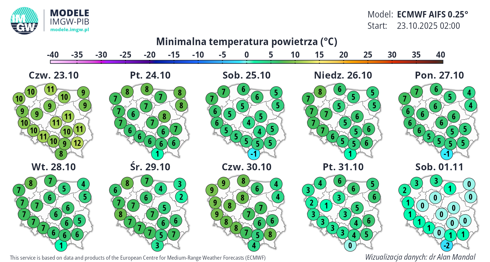 Prognoza średnioterminowa jest publikowana na podstawie wyników predykcji numerycznego modelu pogody ECMWF AIFS 0.25°. Wyniki prezentowane na mapach podlegają codziennej aktualizacji. Prawdopodobieństwo wystąpienia wskazanych wartości może ulec zmianom, zwłaszcza w przypadku terminów odległych od terminu startu modelu (> 7 dni). Więcej o modelu AIFS (czytaj dalej).