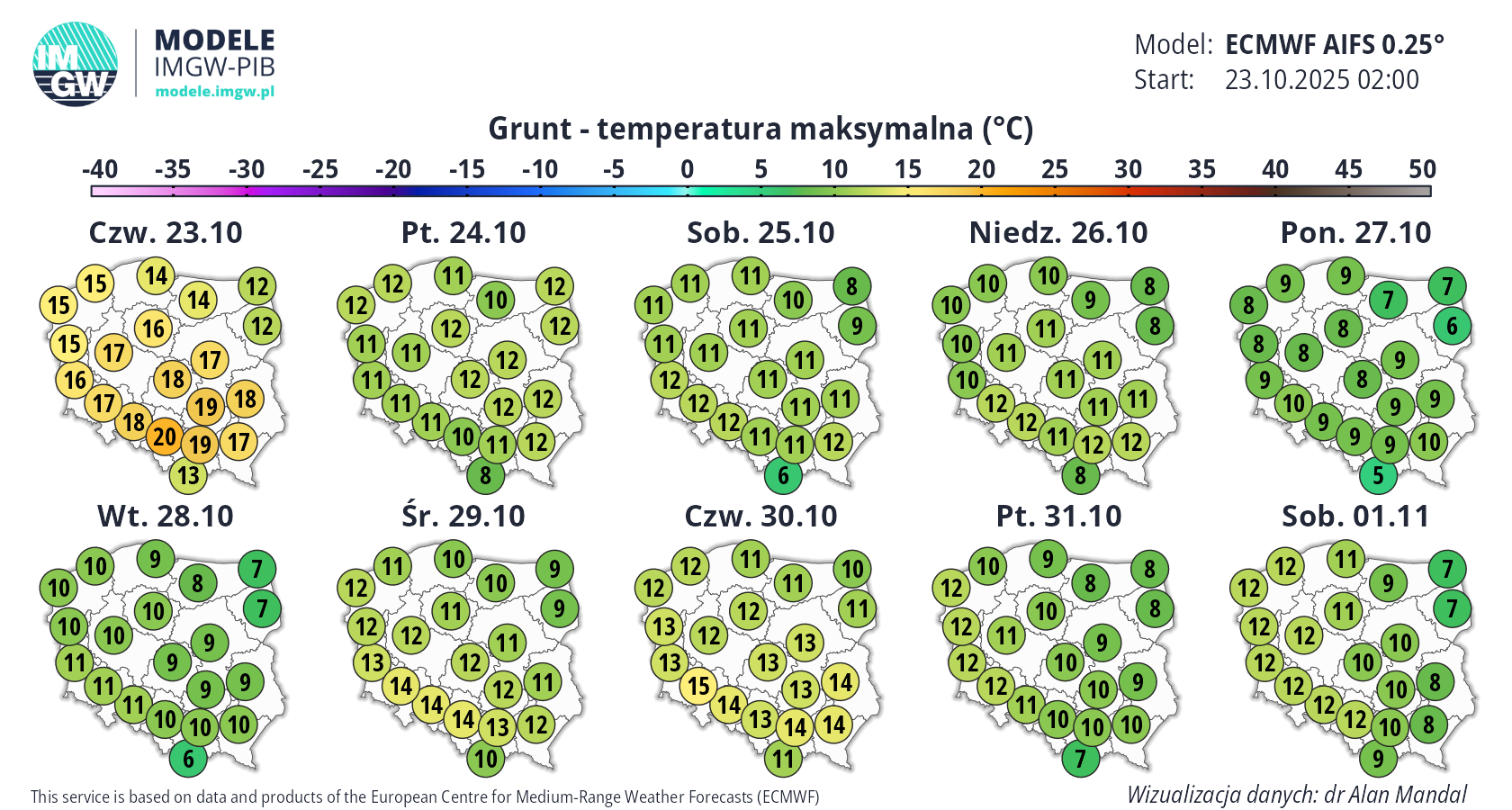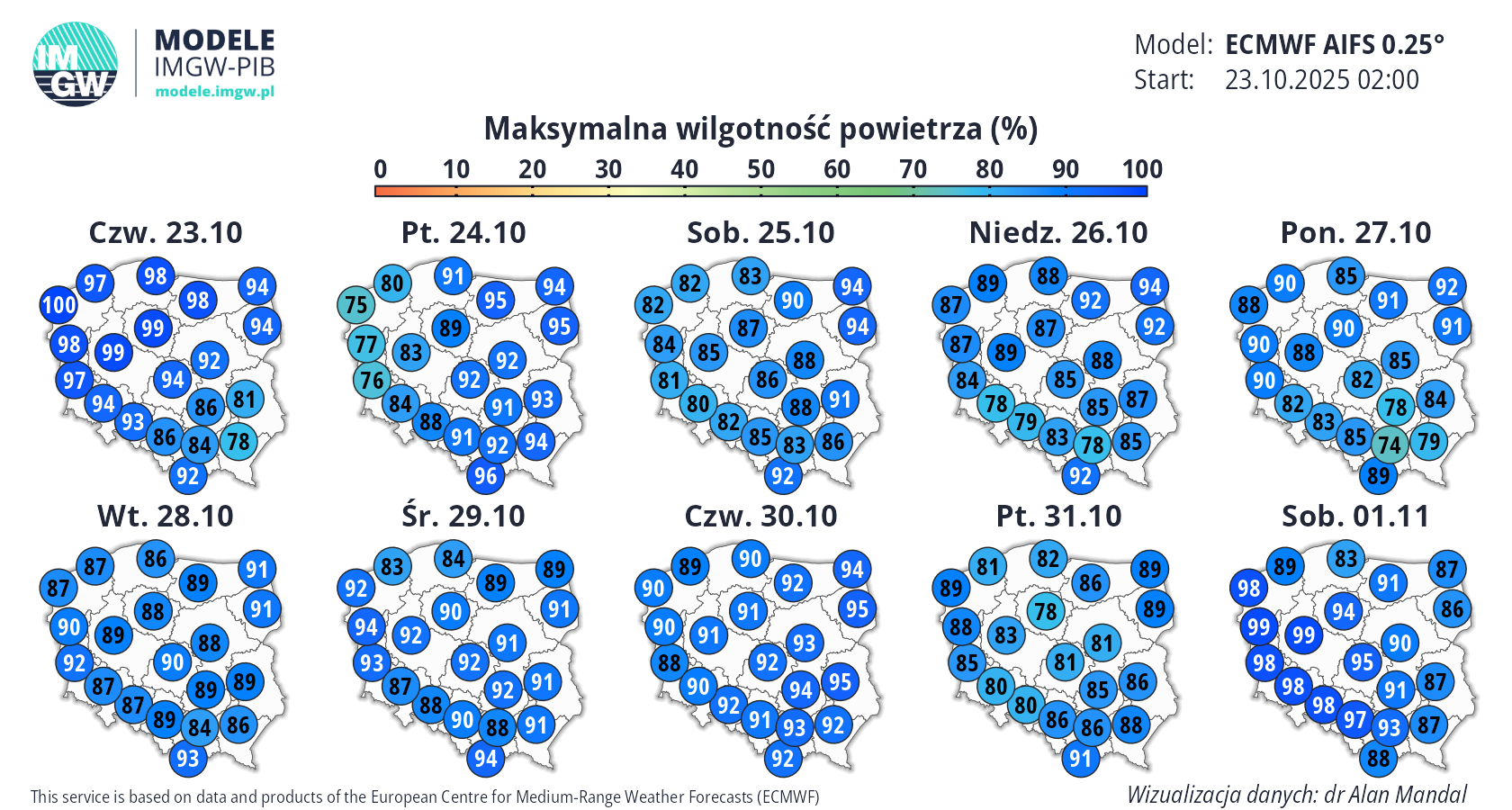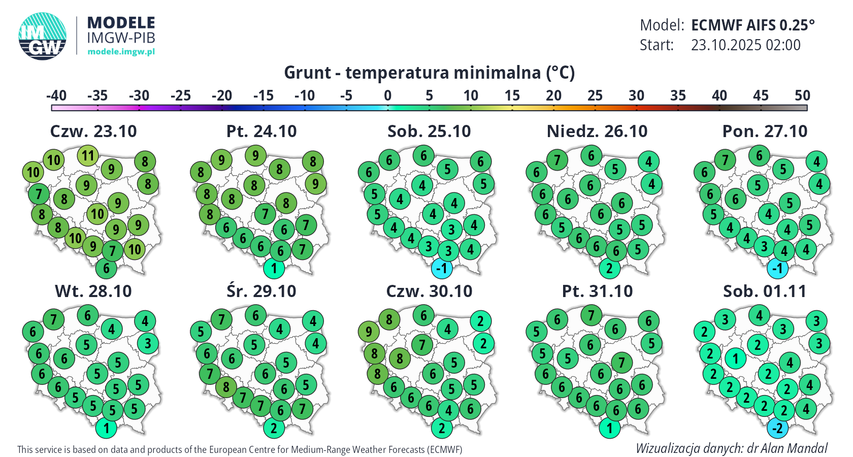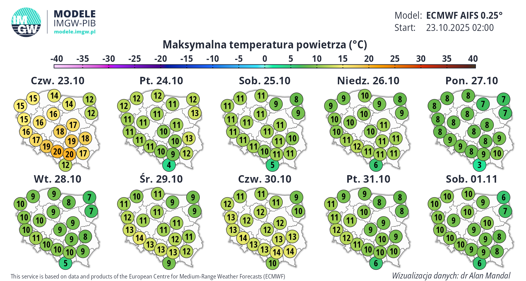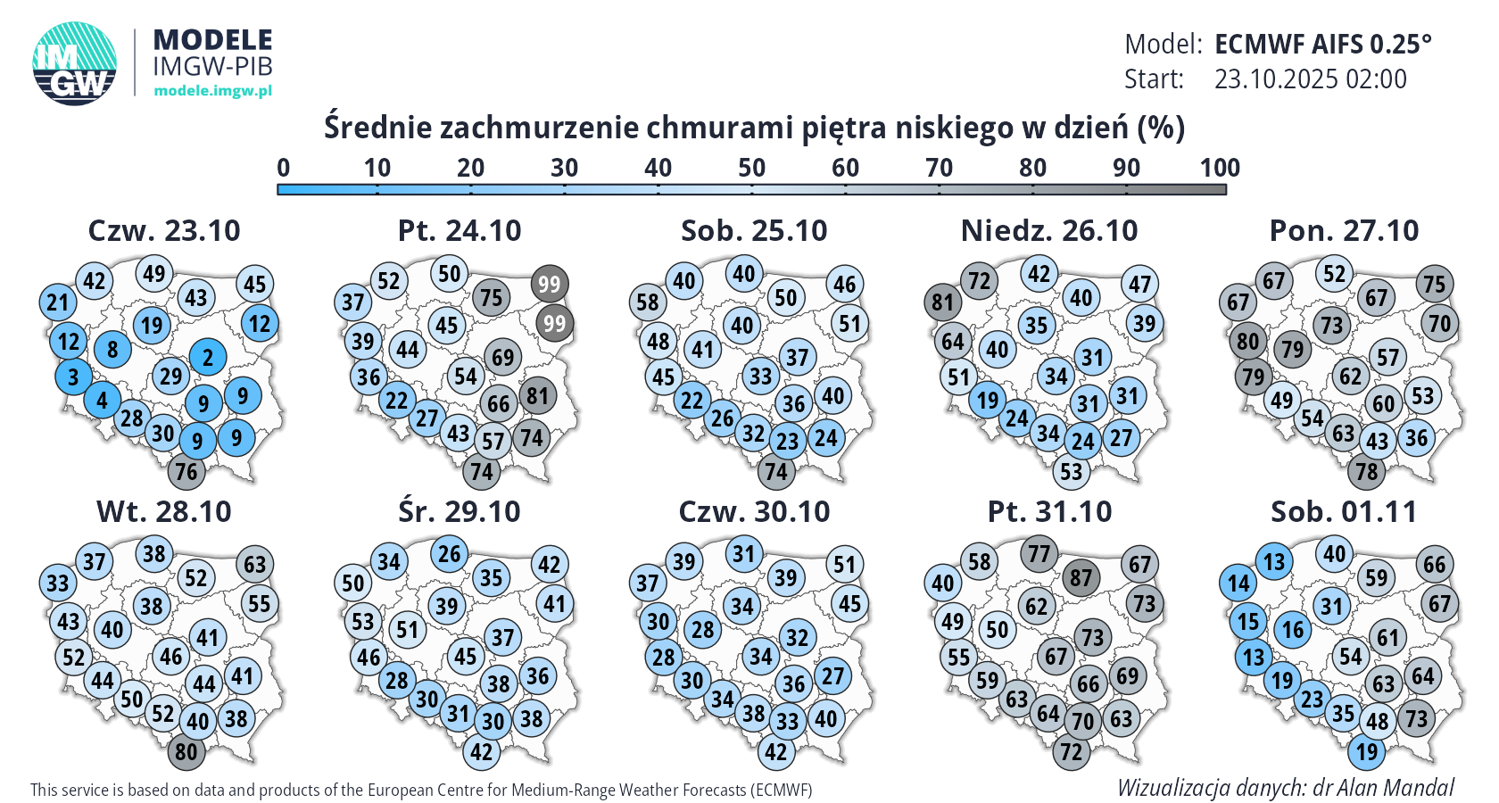 Prognoza średnioterminowa jest publikowana na podstawie wyników predykcji numerycznego modelu pogody ECMWF AIFS 0.25°. Wyniki prezentowane na mapach podlegają codziennej aktualizacji. Prawdopodobieństwo wystąpienia wskazanych wartości może ulec zmianom, zwłaszcza w przypadku terminów odległych od terminu startu modelu (> 7 dni). Więcej o modelu AIFS (czytaj dalej).