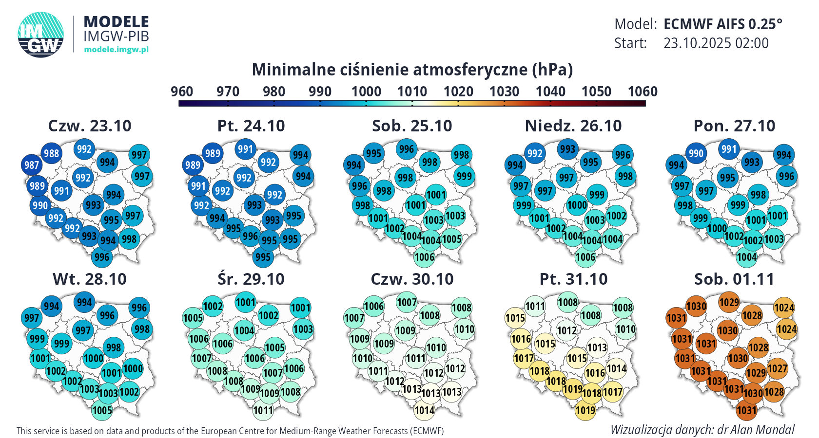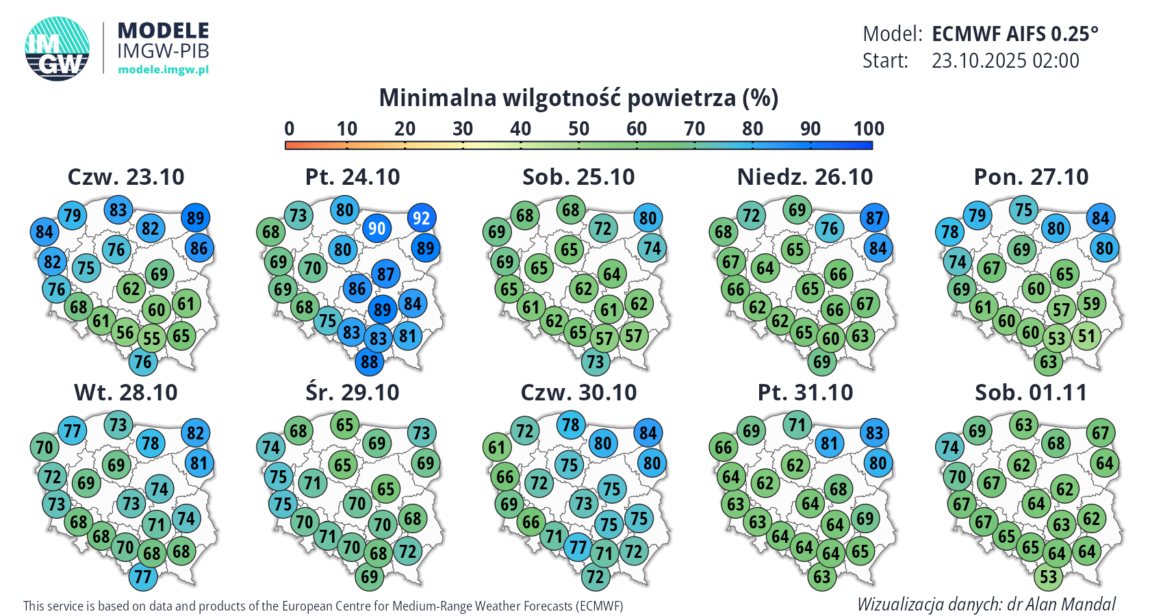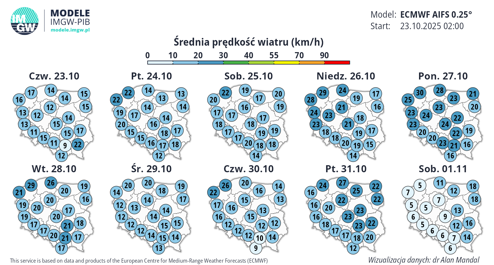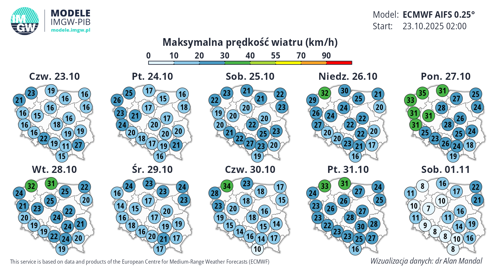 Prognoza średnioterminowa jest publikowana na podstawie wyników predykcji numerycznego modelu pogody ECMWF AIFS 0.25°. Wyniki prezentowane na mapach podlegają codziennej aktualizacji. Prawdopodobieństwo wystąpienia wskazanych wartości może ulec zmianom, zwłaszcza w przypadku terminów odległych od terminu startu modelu (> 7 dni). Więcej o modelu AIFS (czytaj dalej).